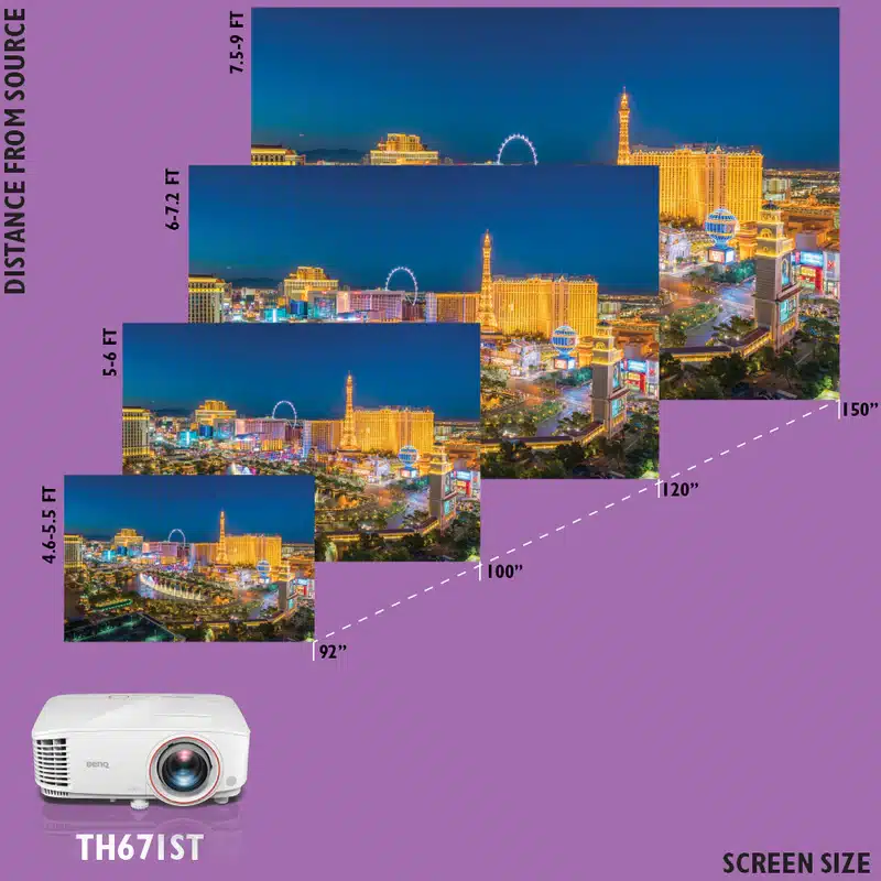 For most golf simulation setups, a short throw projector helps you put the projector where it is needed to fill the screen while being mounted safely outside the hitting area and without casting a shadow. With throw ratios ranging from 0.69 to 0.83, the TH671ST projects 177” (7.7x13ft (screen size); 86x154in (actual viewable size)) -210” image (9x16ft (screen size); 103x183in (actual viewable size)) when placed within just 9-13 feet from the screen, delivering a large picture without the expense of optional lenses.