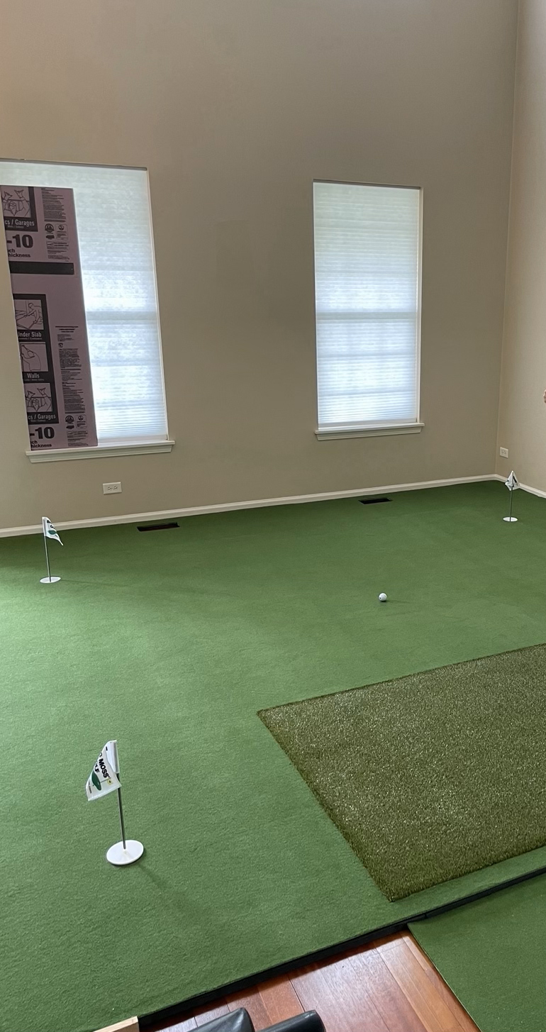 First Cut Fringe surface installs easily and is heavy enough in most cases that it can be laid down without permanent install. Customers use this surface around their putting surface in basements, garages, hallways, porches, simulators, patios and outdoor green installs, etc. Please see photos for ideas and examples