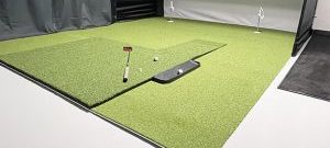 Using a Big Moss SIM green eliminates the need to build up the flooring of your hitting bay to match the height of your hitting mat. The Commander GST Sim green is a fraction under 3/4" at the hitting mat and just under 1.75" at the screen. Every SIM green purchased directly from Big Moss now ships with a 18" x 36" inch Putting and retrieval ramp. Putting ramps include shims so you can exactly match the height of your mat. You may use ANY hitting mat with the Commander GST putting green. This is a far less expensive and time consuming option than building up your floor with EVA foam tiles or a loud wooden deck. These ramps transition the height differential between the putting surface and hitting mat. This makes for a smooth putting experience from your mat down towards the impact screen and also makes it very easy to retrieve balls back onto the hitting mat. In fact, most balls, when hit well enough return automatically to the end of the putting ramp. In this case, you can reach it from your hitting position without moving off the mat.