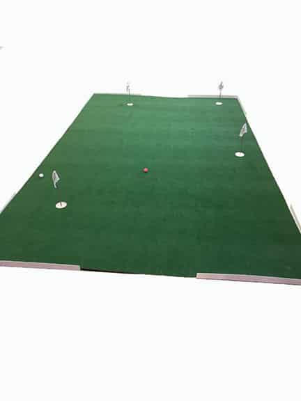 The All New stand alone putting greens are modeled right off the SIM Greens we make for bays. The total cup depth ends up just over 1 inch deep and is able to drop a ball like a real hole. With these greens we are able to cut cups anywhere on the surface. Typically we'll drill 4 to 5 cups depending on the size of the green. This putting green has the feel of being on the practice green on a golf course. You can putt around many balls in various directions without having to be stuck putting only 1 direction. They come with a 3x3 mat to use when hitting small pitches and chips. Balls coming in too fast will be stopped by the corner back stops.
