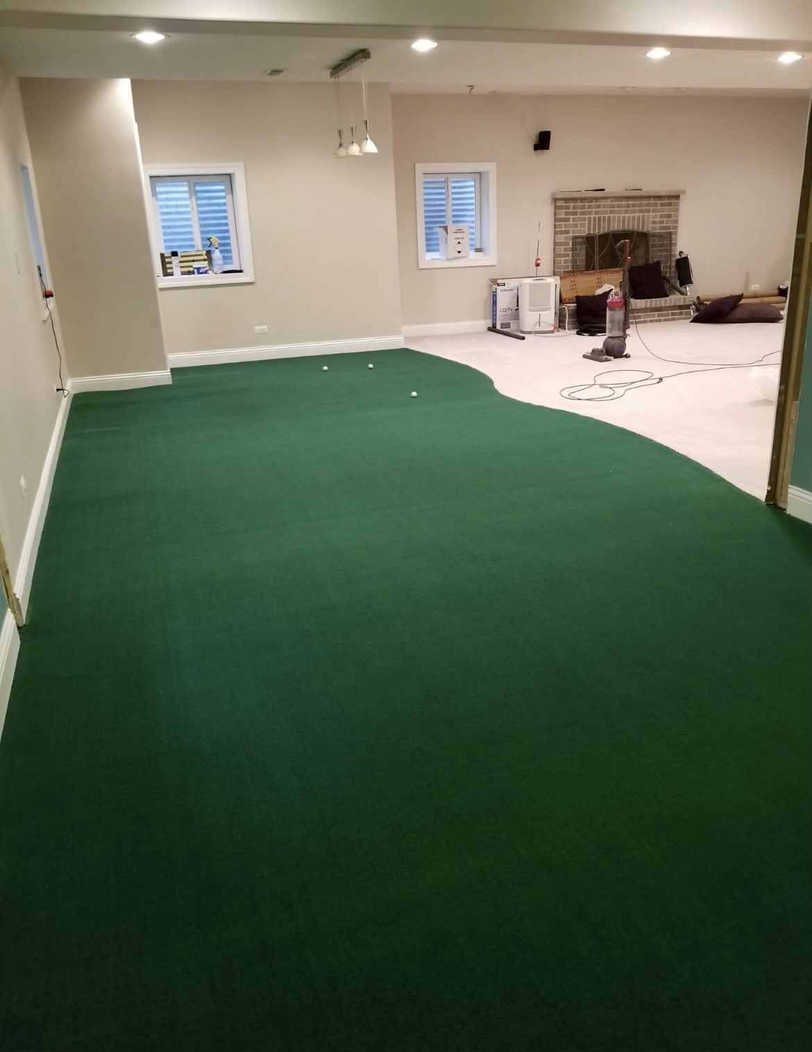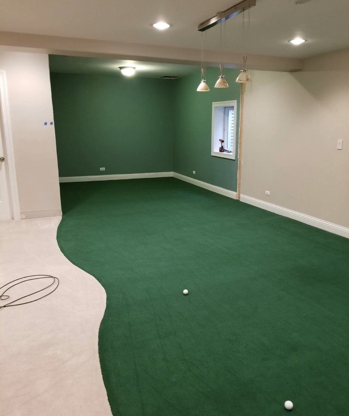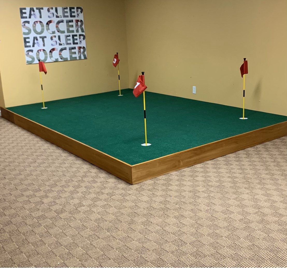 V2 indoor putting surface installs very well and can be used in basements, garages, hallways, porches, simulators, etc. Please see photos & photo gallery page for ideas and examples